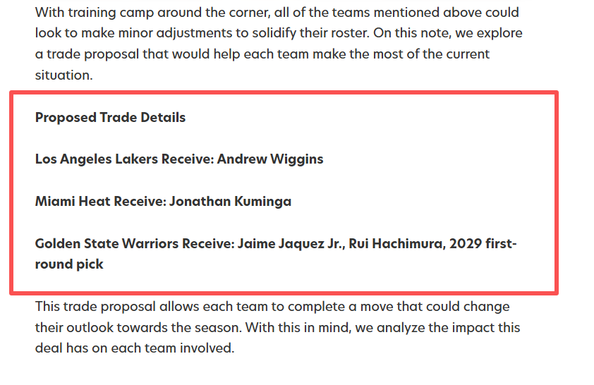 就在这一僵局持续发酵时,今天名记Stein透露的 “湖人对维金斯感兴趣” 的消息,Stein表示,湖人此番有两个意图,一个是补强侧翼提升战斗力,二是尽早寻找一个詹姆斯的替代品。与此同时,美媒FW也提出了一套极具可行性的三方交易方案,来帮助湖人勇士解决麻烦:即洛杉矶湖人队得到维金斯,迈阿密热火收下库明加,金州勇士则收获小海梅・雅克斯、八村塁以及一个湖人的首轮签。这套方案不仅能破解勇士的 “库明加困局”,更能让湖人、热火各取所需,堪称一笔重塑三方未来的 “双赢交易”。